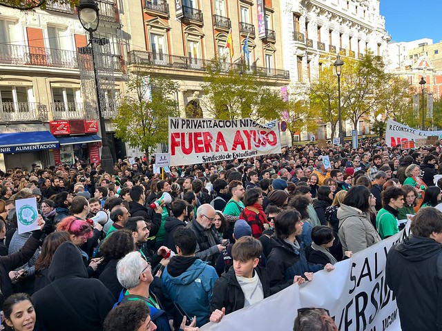 La Complutense se convirtió en epicentro de la respuesta: alrededor de 300 estudiantes pasaron la madrugada del 25 al 26 encerrados preparando materiales y organizando charlas. La misma universidad que hace semanas pidió un préstamo de 34,5 millones a la Comunidad para poder pagar el déficit. Su rector ha asegurado que las nóminas “no están en riesgo”. Que la frase exista ya debería ser una alarma por sí misma.